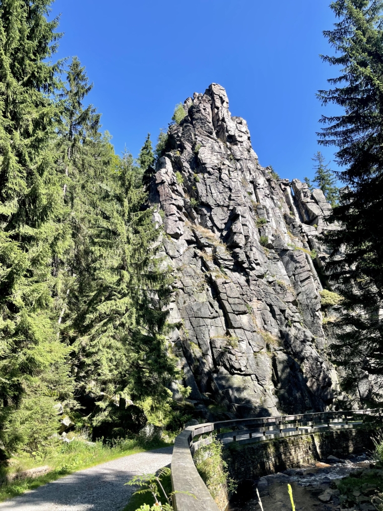 Der Fluss selbst ist ein zentrales Element der Landschaft. Die Schwarze Pockau fließt durch ein enges Tal, bildet kleine Stromschnellen und umspült immer wieder große Granitblöcke. Gerade nach Regenfällen wirkt der Fluss besonders wild und unterstreicht den ursprünglichen Charakter des Tales.