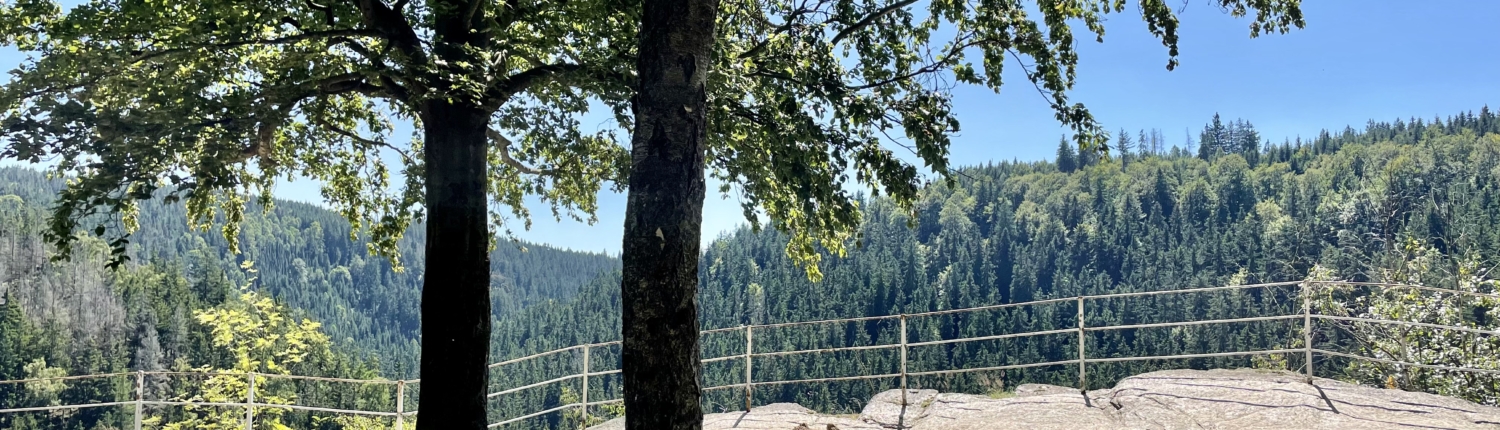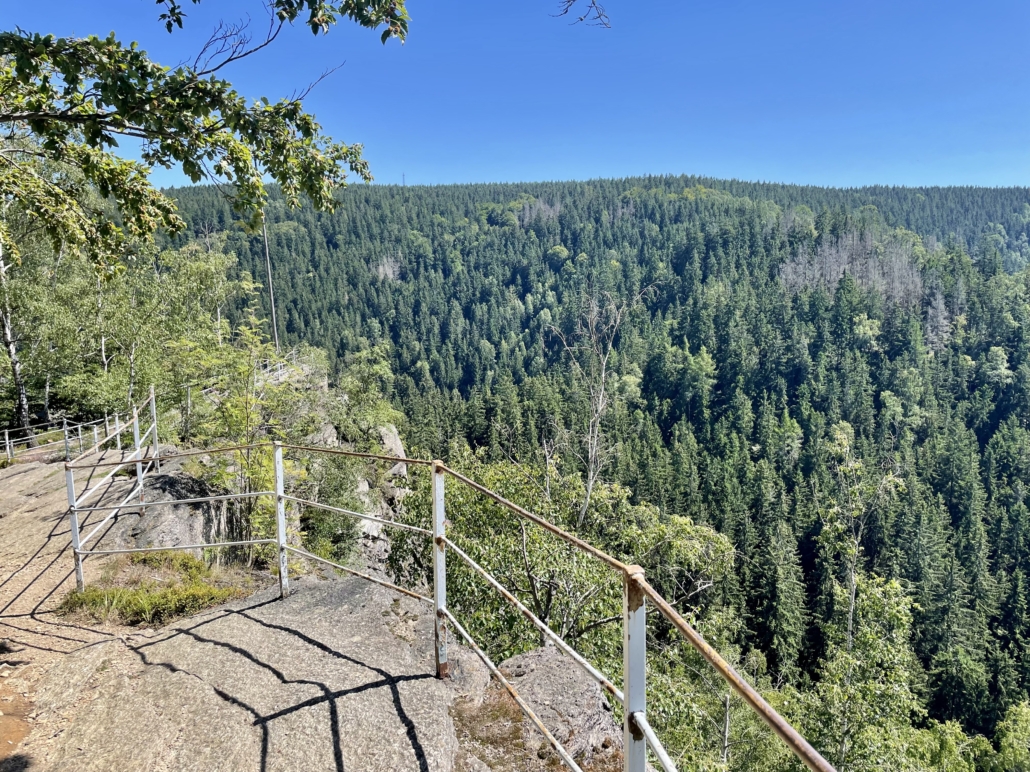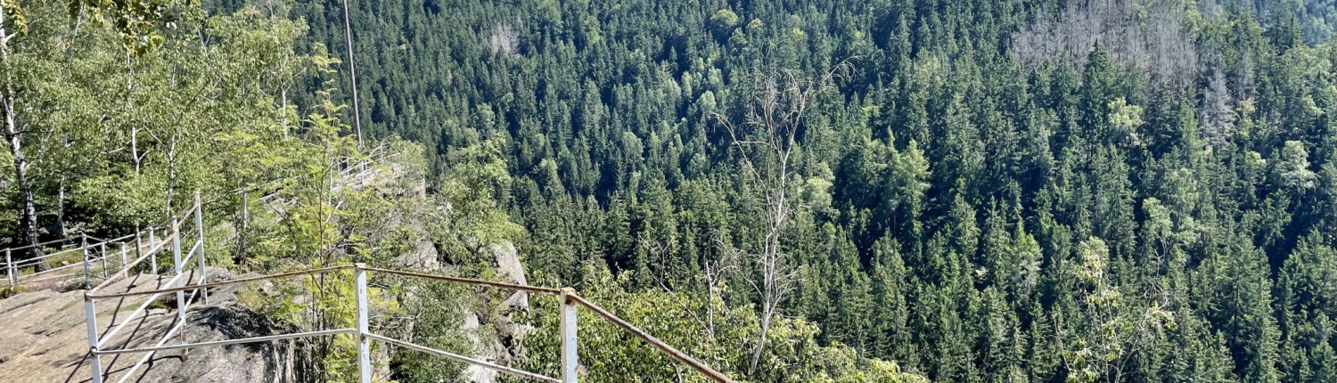 Der Weg führt zunächst durch dichten Wald bergauf, bis schließlich der Aussichtsfelsen erreicht wird. Von hier eröffnet sich ein weiter Blick über die bewaldeten Höhen des Erzgebirges und tief hinunter in das Tal der Schwarzen Pockau.